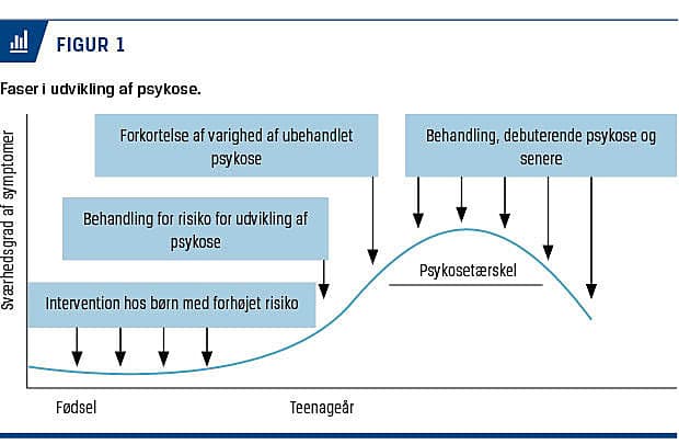 Tidlig specialiseret intervention ved psykose er derfor et højt prioriteret område, og der har været arbejdet med identifikation af muligheder for præmorbid intervention i prodromalfasen, hvor de uspecifikke symptomer viser sig, og i den efterfølgende fase, hvor de første psykotiske symptomer er blevet manifeste (Figur 1).