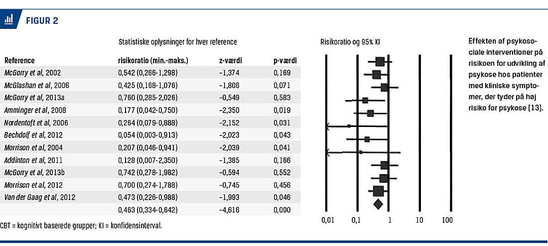 Der er gennemført en række undersøgelser af interventioner, der kan have effekt på transitionsrate og klinisk forløb hos denne gruppe af højrisikopatienter. I en metaanalyse fandt van der Gaag et al [13] evidens for, at kognitiv terapi og andre interventioner hos patienter med UHR kan nedsætte risikoen for transition til psykose (Figur 2).