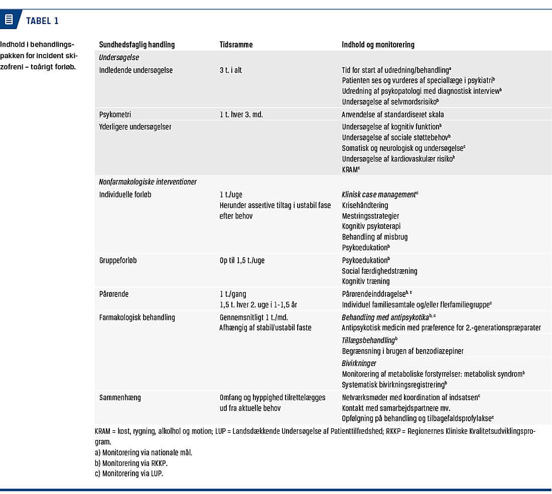 Danske Regioner har vedtaget et koncept for et toårigt pakkeforløb baseret på OPUS-team for unge med debuterende skizofreni. Pakkeforløbets indhold er skitseret i Tabel 1.