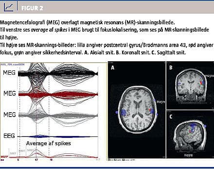 MEG (Elekta-Neuromag) med 306 neuromagnetometere, EEG efter 10-20-systemet og MR-skanning med henblik på kildelokalisering blev udført. Patienten var under undersøgelsen vågen, døsende og sov kortvarigt. På EEG sås der ingen epileptiforme abnormiteter. Ved gennemgang af MEG-data sås tydeligt lange tog af epileptiforme udladninger med 3-4 spikes/s med en varighed af 5-10 s (Figur 1). Der var ingen kliniske symptomer. MEG- og MR-skannings-data blev behandlet i CURRY (Compumedics Limited, Neuroscan) med henblik på lokalisering af det epileptiske fokus. Dipollokalisering (roterende/FIXED MUSIC dipol) med gennemsnit af de 704 bedst definerede spikes (ud af 2.503 spikes) afslørede, at forandringerne formentlig var lokaliseret til højre postcentrale gyrus/Brodmanns area 43 (Figur 2). Under epilepsikirurgisk udredning blev der påbegyndt behandling med en ny medicin (lacosamid), og patienten blev anfaldsfri. Derfor blev hun ikke opereret, men var operabel, hvis der skulle komme recidiv af anfaldene.