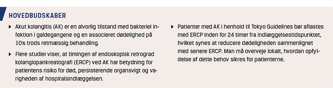 I et dansk studie af Tan et al blev der blandt 166 konsekutive patientforløb med AK påvist en direkte sammenhæng mellem ERCP < 24 timer fra indlæggelsestidspunktet og nedsat 30-dagesmortalitet [12]. Efter justering for ASA-score, hyperbilirubinæmi og leukocytose – som udtryk for hhv. graden af konkurrerende sygdomme, sværhedsgraden af biliær obstruktion og inflammation var ERCP < 24 timer fra indlæggelsestidspunktet forbundet med en reduceret risiko for død inden for 30 dage (oddsratio: 0,23; p = 0,04). Patienterne havde en medianalder på 71 år og en gennemsnitlig ASA-score på 2,7.