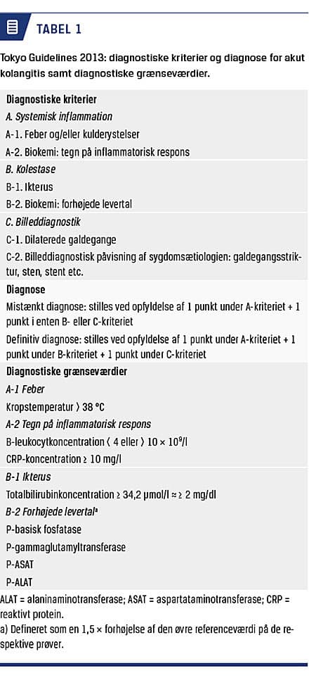 Den kliniske mistanke om AK opstår ved tilstedeværelsen af feber, ikterus og abdominalsmerter i øvre højre kvadrant – som beskrevet i Charcots triade [1], mens diagnosen stilles på baggrund af de internationale Tokyo Guidelines fra 2013 (TG13) (Tabel 1) [5]. Den foretrukne behandling er biliær dekompression, fortrinsvis med endoskopisk retrograd kolangiopankreatografi (ERCP) i kombination med antibiotisk behandling [1, 3]. Hvis ERCP ikke kan gennemføres, kan galdevejene aflastes med perkutan transhepatisk kolangiografi, der pga. en øget komplikationsrate ikke anbefales som førstevalg til biliær drænage [1, 6].