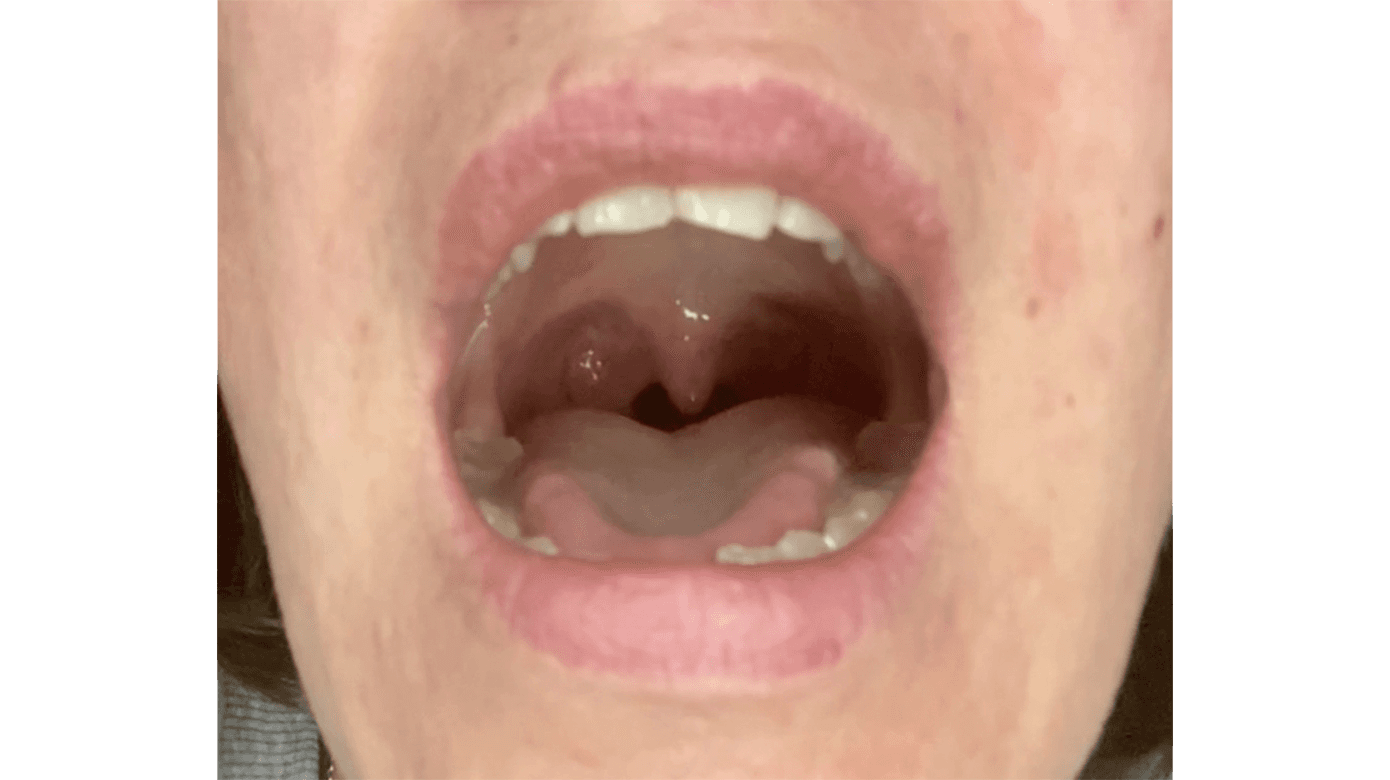 Mistanken om PT blev bekræftet ved fund af ufrivillige bevægelser af den bløde gane, skønt patienten ikke selv kunne mærke disse bevægelser i mundhulen (Figur 1: video).