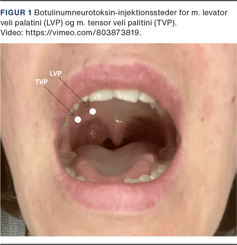 Patienten blev henvist til specialiseret tværfaglig udredning på Neurologisk Afdeling, Bispebjerg Hospital, hvor der findes højt specialiseret funktion for behandlinger af bevægeforstyrrelser. Der blev med fire måneders mellemrum injiceret fire enheder botulinumneurotoksin (BoNT) under elektromyografisk vejledning på hver side af den bløde gane. Patienten oplevede, at der blev lagt en lille dæmper på symptomerne, men de kunne stadig mærkes. Der var ingen betydelig bivirkning.