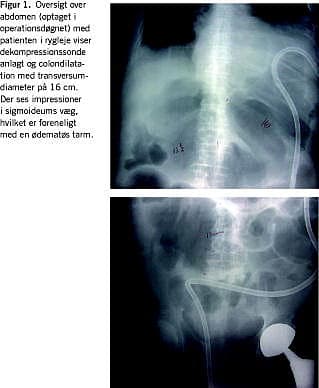En 78-årig mand, der ikke havde væsentlig komorbiditet, fik foretaget revision af en hoftealloplastik. I den postoperative periode fik han abdominalsmerter og -distension, diareer, feber og leukocytose efter fem dages postoperativ behandling med cefuroxim og gentamicin. En computertomografi af abdomen viste svær colondilatation, inflammation og tarmødem som ved toksisk megacolon. Ved en koloskopi sås pseudomembraner, og afføringsprøver var positive for Clostridium difficile. Peroral vancomycinbehandling og dekompression af colon var uden effekt, og der blev foretaget subtotal kolektomi. Efterfølgende bedredes tilstanden.