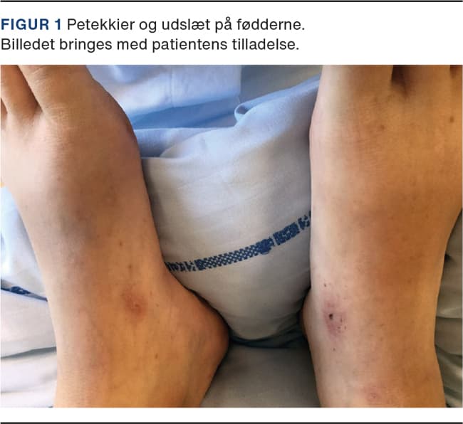 Pga. smerter ved højre fossa iliaca havde man kortvarigt en formodning om perforeret appendicitis. Dette blev afkræftet ved mave- og tarmkirurgisk vurdering. Ved en gynækologisk undersøgelse (GU) fandt man ildelugtende gulligt sekret i vagina, og ved eksploration fandtes rokkeømhed af uterus. På dette tidspunkt var arbejdsdiagnosen TSS på baggrund af tamponfundet, og den antibiotiske behandling blev skiftet til i.v.-givet meropenem, clindamycin og metronidazol. Patienten blev efterfølgende overflyttet til intensivafsnittet på Sjællands Universitetshospital – Roskilde. Hun var på det tidspunkt fortsat hypotensiv og udviklede tegn på dissemineret intravaskulær koagulation i form af tiltagende petekkiale forandringer (Figur 1) og et faldende trombocytniveau til 76 × 109/l, stigende international normaliseret ratio til 1,6 og højt D-dimerniveau på 9,5 FEU/l.