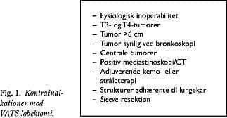 I perioden oktober 1999 til december 2000 (14 mdr.) har afdelingen gennemført ti VATS-lobektomier for primær ikke-småcellet lungecancer. Derudover har vi indledt med VATS-lobektomi i yderligere fire tilfælde, hvor vi under operationen i større eller mindre grad måtte udvide incisionen og afslutte med en åben procedure med brug af spærre i thoraxvæggen. Vores indikation for VATS-lobektomi er perifert beliggende tumor i TNM-stadie I (T1N0M0 og T2N0M0). De internationalt anbefalede kontraindikationer fremgår af Fig. 1. Data om histologisk type, TNM-klassifikation og risikofaktorer for patienterne opereret på vores afdeling fremgår af Tabel 1 (Tabel 1).