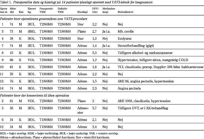 Som det fremgår af Tabel 1 var patienterne ikke selekteret med hensyn til alder og risikoprofil. Kriterierne for VATS-lobektomi var de internationalt anbefalede inklusionskriterier. Kun få var udredt med præoperativ mediastinoskopi, hvilket skyldtes dels uafklaret præoperativ histologi, dels den fortsatte diskussion om indikationen herfor.