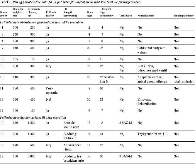 Der er kun offentliggjort et randomiseret studie (4), men der foreligger efterhånden en del case-kontrol-studier, der alle konkluderer, at VATS-lobektomi er et ligeværdigt alternativ til åben lobektomi ved visse tumorlokalisationer. Operationen kan gennemføres efter de sædvanlige kriterier for cancerkirurgi ved åben kirurgi og uden at gå på kompromis med onkologiske principper og graden af radikalitet. Derfor har vi indført denne internationalt anerkendte og formentlig patientvenlige operationsteknik på vores afdeling. Vi rapporterer her resultaterne fra de første ti gennemførte VATS-lobektomier for ikke-småcellet lungecancer.