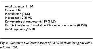 Siden det første offentliggjorte materiale om torakoskopiske lobektomier i 1992 (2) har denne procedure været centrum for stor interesse og også skepsis. Hurtigt blev de første serier, som udelukkende omhandlede VATS-lobektomier ved lungecancer, offentliggjort (3). Der var ikke tale om randomiserede studier, men resultaterne antydede, at den torakoskopiske operation gav kortere indlæggelser og færre smerter.