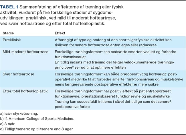 Behandlingen af hofteartrose er primært symptomlindrende og kan bestå af medicinsk smertebehandling, vægttab og træning. Hvis dette ikke virker tilstrækkeligt, kan total hoftealloplastik (THA) være påkrævet. Træning har tiltrukket en del forskningsmæssig bevågenhed og kan defineres som en systematisk udførelse af øvelser mhp. på opnåelse af specifikke terapeutiske mål, som er relateret til genskabelse af normal muskuloskeletal funktion eller til reduktion af smerte forårsaget af sygdom eller skader. I tillæg til de specifikke terapeutiske effekter relateret til hofteproblemer per se har fysisk træning desuden en lang række velkendte præventive helbredseffekter. Vi ønsker med denne artikel at sammenfatte effekterne af træning eller fysisk aktivitet, vurderet på fire forskellige stadier af sygdomsudviklingen, nærmere bestemt: 1) præklinisk, 2) ved mild til moderat hofteartrose, 3) ved svær hofteartrose og 4) efter THA. I denne artikel fokuseres der på effekten af træning på fire forskellige sygdomsstadier ved et typisk hofteartroseforløb.