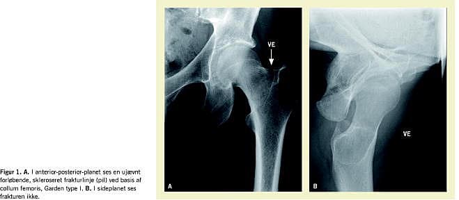 Ved radiologisk undersøgelse sås der i anterior-posterior-planet en ujævnt forløbende, skleroseret frakturlinje ved basis af collum femoris, Garden type I. I sideplanet sås frakturen ikke (Figur 1 ).