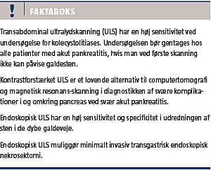 Akut pankreatitis er en sygdom, der forårsager lokal inflammation. Sygdommen har en tidlig og en sen fase, hvad angår komplikationer og mortalitetsrisiko [1, 2]. Galdesten er sammen med overforbrug af alkohol hovedårsagerne til akut pankreatitis [1]. Transabdominal ultralydskanning (ULS) har i mange år været en vigtig bestanddel i den ætiologiske udredning af akut pankreatitis, men undersøgelsens forskellige modaliteter bør i stigende grad også anvendes ved både tidlige og sene komplikationer i forbindelse med akut pankreatitis. Vi skildrer i følgende gennemgang, hvornår og hvorfor transabdominal ULS, kontrastforstærket ULS og endoskopisk ULS er indiceret ved akut pankreatitis.