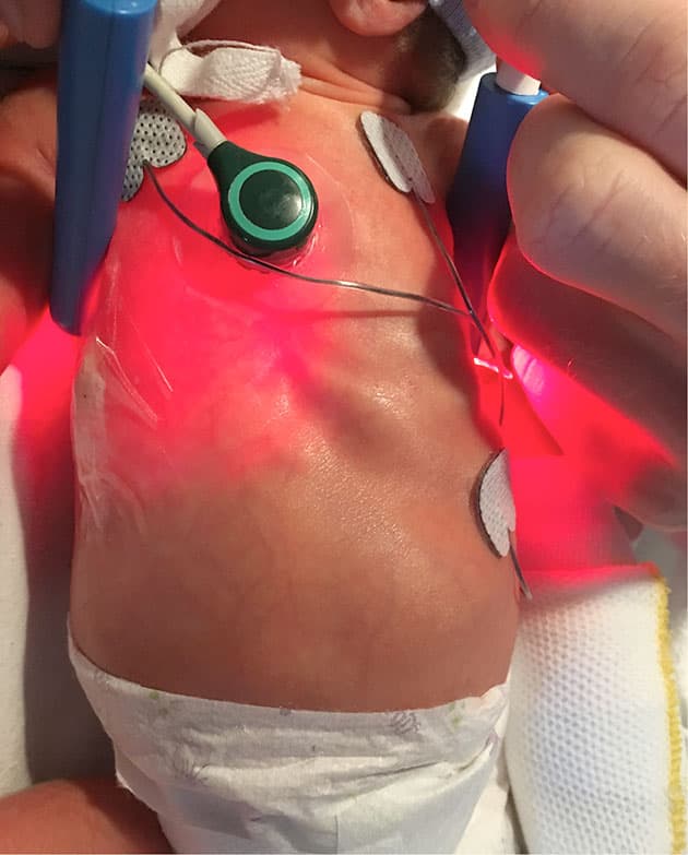 Der findes ingen guldstandard for diagnosticering af PTX hos nyfødte [1]. CXR bruges ofte, men er tidskrævende. LUS anvendes primært hos voksne, men i flere studier har det vist lovende resultater hos neonatale [1-3]. LUS er dog ikke mulig at foretage på alle neonatale afsnit og operationsstuer. Under akutte forhold kan TI derfor supplere og guide den kliniske evaluering samt være vejledende ved torakocentese [4, 5]. Hos det præmature barn på billedet blev TI anvendt i det akutte forløb ved udvikling af truende PTX med respiratorisk påvirkning.