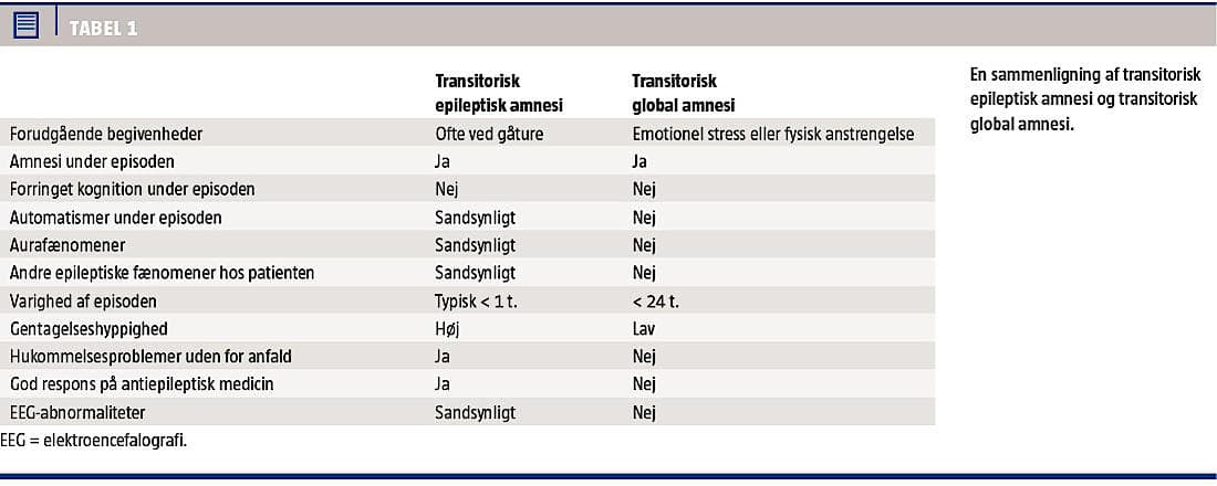 TEA kan blive misdiagnosticeret som transitorisk cerebral iskæmi, psykogent anfald, dementia eller transitorisk global amnesi (TGA). Det kan være svært at skelne TEA og TGA fra hinanden, men der er forskelle (Tabel 1). TEA kan gentage sig op til flere gange årligt, hvorimod gentagelse af TGA er usædvanlig og kun ses hos 6-10% af patienterne [1, 5]. Både TEA og TGA har antero- og retrograd amnesi, men kortere varighed af anfaldene og inkomplet hukommelsestab under anfald taler for TEA [3, 5].