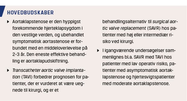 Flere randomiserede undersøgelser har vist, at TAVI medfører en signifikant reduceret mortalitet og forbedret symptomatologi i forhold til medicinsk behandling hos inoperable patienter [6], og at TAVI er ligeværdig med SAVR ved intermediær og høj operativ risiko [7-12]. Imidlertid kan resultaterne fra undersøgelser af ældre patienter med forhøjet operationsrisiko ikke nødvendigvis generaliseres til alle patienter med aortastenose, og yderligere kontrollerede studier er påkrævet, inden behandlingen udbredes til andre patientgrupper. I igangværende undersøgelser sammenligner man SAVR og TAVI hos patienter med svær aortastenose og lav operativ risiko (ClinicalTrials.gov id: NCT02825-134), patienter med svær, men asymptomatisk aortastenose (NCT03042104) og patienter med moderat aortastenose og hjertesvigt (NCT02661451).