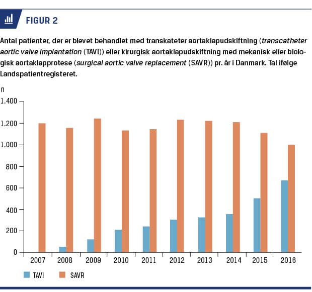 På mindre end et årti er indikationerne for TAVI gået fra symptomatisk, svær aortastenose og høj eller prohibitiv operativ risiko til intermediær risiko. Både videreudvikling af de forskellige transkateterbioproteser og den periprocedurale behandling har medført markant forbedrede resultater over årene. Et stigende antal danske patienter med aortastenose behandles hvert år med TAVI, som ved minimalistprocedure kan foregå i lokalanæstesi med adgang via lysken, og patienterne kan udskrives efter 1-2 dages indlæggelse, uden at det påvirker procedurens sikkerhed.