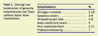 Den samlede 30-dages mortalitet er på 5-18%. Apopleksi cerebri forekommer hos 3-9% [7]. Disse tal skal ses i lyset af, at det hidtil kun er inoperable patienter der er blevet behandlet med TAVI.