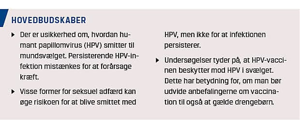 Denne artikel har til formål at formidle relevant viden om transmission af og infektion med HPV i mundsvælget og bygger primært på retrospektive studier. Der savnes således prospektive studier, som kan bekræfte hypotesen om, at seksuel adfærd fører til HPV-relateret mundsvælgkræft, og at den persisterende infektion fører til malign transformation i mundsvælget. Vi mangler større kendskab til udviklingen af HPV-infektion i mundsvælget over tid, før den bliver til kræft.