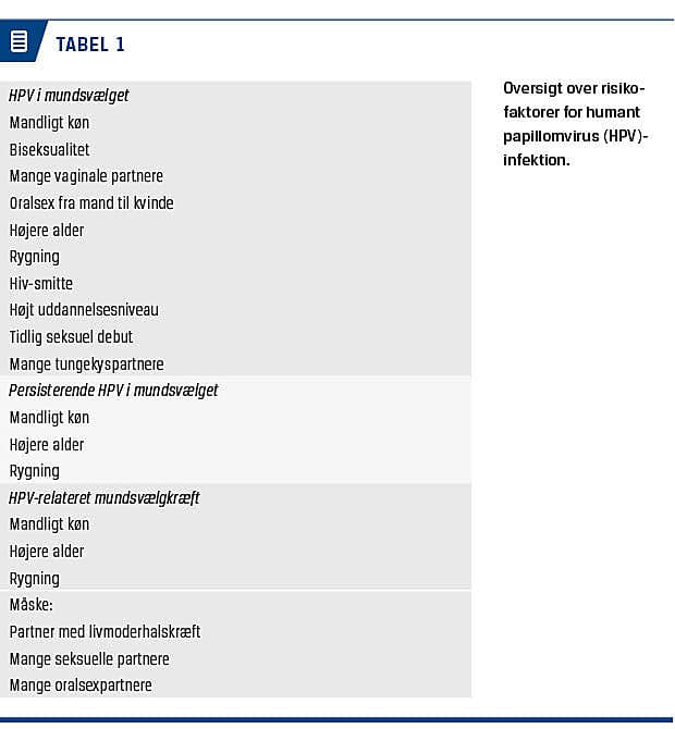 Risikofaktorer for HPV-infektion i mundsvælget er mandligt køn, biseksuel orientering, ingen fast partner, flere vaginale partnere, hyppig oralsex fra mand til kvinde, ano-oral-sex, hiv-positiv status, rygning, højere alder, høj uddannelse og tidlig alder ved seksuel debut [10, 12, 19, 20] (Tabel 1). Et stort antal tungekyspartnere er muligvis også associeret med øget incidens af oral HPV-infektion, men flere valide studier af dette mangler [21, 22]. HPV-incidensen er størst i populationer fra venerologiske klinikker (16 pr. 1.000 person-mdr.) faldende til ca. halvdelen blandt studerende og endnu lavere hos ikkestuderende voksne [20].