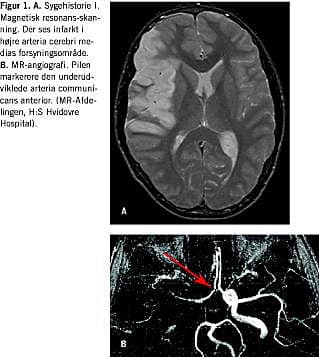 På grund af progredierende symptomer foretog man magnetisk resonans (MR)-skanning af cerebrum, og ved skanningen kunne man påvise iskæmiforandringer i højre hemisfære svarende til a. cerebri medias forsyningsområde. Ved angiografi sås der intet flow i højre a. carotis interna og kun sparsomt flow i højre a. cerebri media og enkelte af dennes forgreninger. Circulus Willisii (circulus arteriosus cerebri) fandtes inkomplet med en underudviklet a. communicans anterior (Figur 1 ).