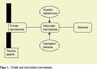 Den primære hjerneskade opstår i traumeøjeblikket, den kliniske effekt ses umiddelbart og kan med den nuværende viden ikke behandles. I modsætning hertil opstår den sekundære hjerneskade minutter, timer eller dage efter traumetidspunktet på grund af patofysiologiske forhold, der ved optimal håndtering vil kunne forhindres eller minimeres. Ideelt set ville prognosen efter traumatisk hjerneskade udelukkende være bestemt af art og omfang af den primære skade. En sekundær hjerneskade forværrer prognosen, fordi den »adderes« til den primære skade (Figur 1 ).