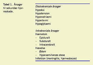 På grund af neuroners ekstreme følsomhed for oxygenmangel vil hypoksi og/eller iskæmi i hjernen medføre celledød og dermed sekundær hjerneskade. Cerebral hypoksi/iskæmi efter et traume kan have både systemiske (ekstrakraniale) og intrakraniale årsager (Tabel 1 ). For begge er et enten regionalt eller globalt fald i det cerebrale perfusionstryk (CPP) den hyppigste »fællesnævner« for den sekundære hjerneskade. CPP er forskellen mellem middeltrykket i det ekstrakraniale kredsløb (MAP) og det intrakraniale tryk (ICP): CPP = MAP-ICP [4].