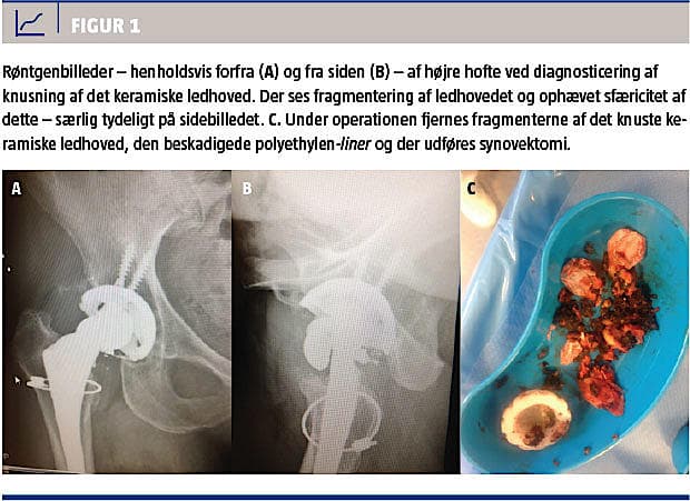 En 68-årig kvinde henvendte sig den 19. juni 2013 hos en ortopædkirurg med gener fra sin højre hofte. Hun havde i 1997 fået foretaget højresidig hoftealloplastik, og i 2006 blev der foretaget revision heraf pga. løshed: Man isatte et 28-mm-keramisk ledhoved i en polyethylen–acetabulær-liner. Herefter var hoften velfungerende, indtil hun i april 2013 faldt på et stengulv i Italien og landede direkte på højre hofte. Hun fik et blåt mærke, men fortsatte med at undervise på sin egen rideskole og ride selv. En måned efter faldet kom der en skurrende lyd fra hoften og smerter. Hun søgte læge i Italien, og der blev taget et røntgenbillede i ét plan (forfra), men uden at der blev stillet nogen diagnose. Hun kontaktede efterfølgende en ortopædkirurg i Danmark, hvor man fandt ens benlængde, normal lejring af benet på lejet, men svært indskrænket, smertefuld bevægelighed. Røntgenbilleder i to plan afslørede, at ledhovedet var fragmenteret (Figur 1 A + B), men taper’en (stemmets hals, hvorpå ledhovedet var monteret) var inden for hofteskålen. Man indhentede den tidligere operationsbeskrivelse, hvoraf det fremgik, at der var isat et 28-mm-keramisk ledhoved i en 54 mm polyethylen-liner.