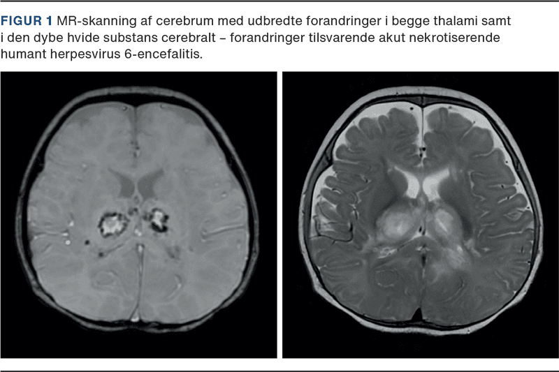 Barnet blev behandlet med fortsat mekanisk ventilation, betydelig kredsløbsstøtte, plasmaferese og hæmodialyse. MR-skanning af cerebrum viste udbredte forandringer i begge thalami samt i den dybe hvide substans svarende til HHV6-associeret ANE (Figur 1). På baggrund af det alvorlige neurologiske og hepatologiske sygdomsbillede og i samråd med forældrene blev der truffet beslutning om ikke at fortsætte med livsforlængende behandling. Barnet overgik til palliativ behandling og afgik ved døden efter en uges indlæggelse.