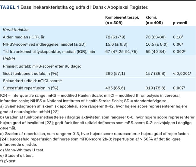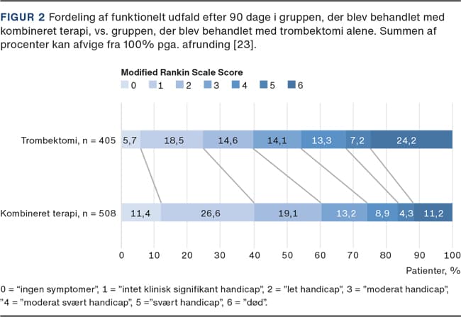 Patienterne i de to behandlingsgrupper adskilte sig ikke mht. alder eller apopleksiens sværhedsgrad, men der var en forsinkelse i ankomst til lyskepunktur på 8 min i gruppen, der fik kombineret terapi. Den statistiske sammenligning viste, at der var en signifikant højere andel af patienter med godt funktionelt udfald (57,1% vs. 38,8%, p < 0,0001) og succesfuld reperfusion (85,6% vs. 78,8%, p = 0,007) i gruppen, der fik kombineret terapi, end i gruppen, der fik trombektomi alene (Tabel 1). De patienter, der blev behandlet med kombineret terapi, klarede sig altså bedre end de patienter, der blev behandlet med trombektomi alene (Figur 2).