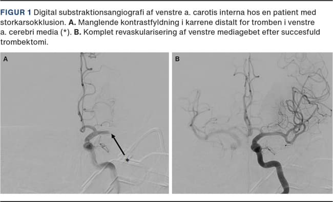 Behandlingen af iskæmisk apopleksi har gennemgået en stor udvikling. Trombolyse med plasminogenaktivatoren alteplase blev evidensbaseret i 1995 og gradvist indført i Danmark i perioden 2004-2008 [1, 2]. Behandlingsvinduet blev udvidet til 4,5 t. i 2008 [3]. I 2015 fandt man i flere randomiserede kontrollerede studier evidens for fjernelse af blodpropper ved hjælp af et kateter (trombektomi) senest 6 t. fra symptomdebut, hvis der var tale om en storkarsokklusion, dvs. en trombe i a. carotis interna eller a. cerebri medias første stykke (M1) [4-7]. Ved disse store tromber kunne trombolyse alene ikke medføre fuld reperfusion. Behandlingsvinduet blev i 2018 udvidet til 24 t. under forudsætning af, at der på en skanning fandtes mismatch mellem klinik og infarktstørrelse [8]. I dag baseres retningslinjerne for behandlingen på en kombination af de to behandlingsmodaliteter, hvor kvalificerede patienter får trombolyse efterfulgt af trombektomi [9].