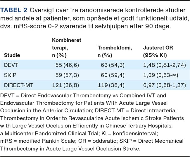I SKIP-studiet fandt man, at 59,4% af patienterne, der fik trombektomi alene, opnåede et godt funktionelt udfald mod 57,3% af patienterne, der fik kombineret terapi [13]. På trods af næsten identiske rater for de to behandlingsgrupper opfyldte disse data ikke kriteriet for noninferioritet [13]. Der var dog rent numerisk en større andel af patienter med godt funktionelt udfald i gruppen, der fik trombektomi alene, end i gruppen, der fik kombineret terapi [13]. Overordnet rapporterede man altså i de to studier om samme tendens, nemlig at trombektomi alene var noninferior sammenlignet med kombineret terapi [12, 13]. Med denne konklusion tilslutter de to studier sig et tredje randomiseret kontrolleret studie, DIRECT-MT fra 2020, som efter randomisering af 656 patienter ligeledes viste, at trombektomi alene var noninferior til kombineret terapi [14]. Man fandt, at 36,4% af patienterne, der fik trombektomi alene, opnåede et godt funktionelt udfald mod 36,8% af patienterne, der fik kombineret terapi [14]. Desuden var der ingen signifikant forskel i blødningsrisiko mellem de to behandlingsgrupper [14] (Tabel 2).