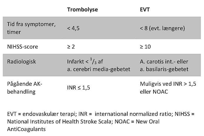 EVT rekanaliserer store okklusioner hurtigere end trombolyse. Den kliniske effekt af behandlingen er undersøgt i flere randomiserede studier [3]. Her evaluerede man trombolyse alene vs. trombolyse + EVT/pladehæmmer, EVT/trombolyse eller EVT alene. Ingen af disse studier kunne påvise nogen signifikant forskel i klinisk outcome mellem hhv. medicinsk behandling og EVT.