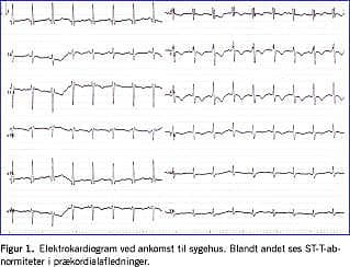 I det medicinske modtageafsnit klagede hun over åndenød og et hævet venstre ben. Objektivt fandtes en hjertefrekvens på 117 slag/minut, blodtryk på 129/93 mmHg, temperatur på 37,6 C og transkutan iltsaturation på 87% uden ilttilskud. Klinisk var der ingen tegn på cirkulationssvigt eller cor pulmonale. Hjerte- og lungestetoskopi var uden abnorme fund fraset takykardi og takypnø. Venstre ben var hævet og ømt langs karskeden. Elektrokardiogram (EKG) ses i Figur 1. Arteriegasanalyse efter påbegyndt iltbehandling viste respiratorisk alkalose uden hypoksæmi. På mistanke om dyb venetrombose og lungeemboli blev der givet dalteparin 18.000 internationale enheder (IE) subkutant og rekvireret subakut spiral computertomografi (CT) af thorax.