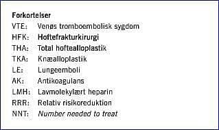 Kirurgi er den vigtigste risikofaktor for udvikling af venøs tromboembolisk sygdom (VTE). Cirka en tredjedel af alle tilfælde af VTE ses efter kirurgiske indgreb [1, 2]. Risikoen er særlig høj efter hoftefrakturkirurgi (HFK) og total hofte- og knæalloplastik (THA og TKA), og da disse operationer samtidig er ganske hyppige, er det ved at blive en tradition, at man begynder med disse patientgrupper, når den tromboseprofylaktiske effekt af nye antikoagulantia skal undersøges. Det har også været tilfældet med det nyligt markedsførte pentasakkarid fondaparinux og trombinhæmmeren melagatran, som markedsføres senere i år.