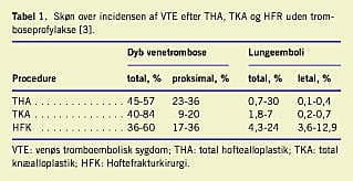 I Tabel 1 vises et skøn over prævalensen af VTE efter THA, TKA og HFK, når operationerne udføres uden tromboseprofylakse [3]. Det ses, at dyb venetrombose (DVT) kan påvises venografisk hos ca. halvdelen af patienterne med ligelig fordeling på distale og proksimale tromboser. I de fleste tilfælde vil tromberne regrediere spontant, men i ca. 20% af tilfældene udvikles der symptomgivende VTE. Det kan ske i form af DVT, lungeemboli (LE) eller begge dele.