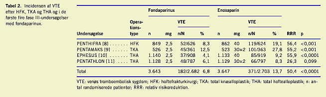 Fondaparinux er et syntetisk pentasakkarid, svarende til den del af heparinmolekylet, som er ansvarlig for heparins potensering af antitrombins antikoagulerende effekt. Fondaparinux bindes kun til antitrombin, mens ufraktioneret heparin i høj grad og LMH i nogen grad også bindes til trombin. Fondaparinux har en væsentlig længere biologisk halveringstid (ca. 14 timer) end ufraktioneret heparin (1-2 timer) og LMH (2-4 timer). Det er derfor muligt at opnå en mere stabil antikoagulerende effekt med en enkelt daglig injektion af fondaparinux end med ufraktioneret heparin og LMH. Den tromboseprofylaktiske effekt af fondaparinux sammenlignet med enoxaparin er evalueret i fire fase III-studier: PENTHIFRA, PENTAMAKS, EPHESUS og PENTATHLON [7-10]. Alle undersøgelserne vedrørte patienter, der fik foretaget hofte- eller knækirurgi (PENTHIFRA: HFK, PENTAMAKS: TKA, EPHESUS og PENTATHLON: THA). I PENTAMAKS og PENTATHLON fik kontrolgruppen amerikansk profylakseregimen med enoxaparin 30 mg × 2 daglig, indledt 12 timer postoperativt. I de øvrige to undersøgelser fik kontrolgruppen europæisk profylakseregimen med enoxaparin 40 mg × 1 daglig, indledt 12 timer præoperativt. I alle undersøgelserne fik testgruppen fondaparinux 2,5 mg × 1 daglig indledt 6 ± 2 timer postoperativt.