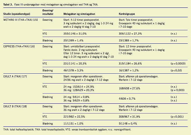 Den tromboseprofylaktiske effekt af melagatran og ximelagatran ved ortopædkirurgi er undersøgt i fase III-studierne METHRO III (THA og TKA), EXPRESS (THA og TKA) og EXULT (TKA). I Tabel 3 vises en oversigt over studierne (14-17). Fase II-studiet METHRO II viste signifikant lavere hyppighed af VTE blandt patienter, der fik den højeste dosis trombinhæmmer (melagatran 3 mgsubkutant × 2 daglig i 1-3 døgn efterfulgt af ximelagatran 24 mg × 2 til dag 11), end i kontrolgruppen (dalteparin 5.000 IE subkutant × 1 daglig i 8-11 dage) (15,1% vs. 28,2%, p < 0,0001), men der var samtidig en tendens til flere blødningskomplikationer (5,0% vs. 2,4%, nonsignifikant.) (14). I METHRO III valgte man at indlede tromboseprofylakse med melagatran 4-12 timer postoperativt for derved at nedsætte risikoen for blødningskomplikationer. Undersøgelsen indfriede forventningerne om færre blødninger, men til gengæld var effekten så ikke højere end i kontrolgruppen. I EXPRESS genoptog man præoperativ start på profylaksen med reduceret dosis (2 mg). Man fik da igen højere effekt end i kontrolgruppen, men på ny flere blødningskomplikationer (15). EXULT-studierne viste, at ximelagatran 36 mg × 2 daglig (men ikke 24 mg × 2 daglig) indledt dagen efter operationen forebyggede postoperativ VTE mere effektivt end behandling med warfarin påbegyndt om aftenen på operationsdagen [16, 17].