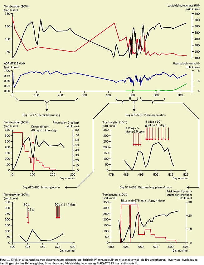 II. En 38-årig tidligere rask kvinde med trombocytopeni og Coombs-negativ hæmolytisk anæmi blev behandlet med højdosissteroid, hvorefter trombocyttallet normaliseredes over to uger. Herefter blev steroidbehandlingen langsomt udtrappet, men ved 25 mg prednisolon daglig recidiverede trombocytopeni og hæmolyse. Der suppleredes med dexamethason, 40 mg daglig i fire dage, hvorefter trombocyttallet igen normaliseredes. Trombocyttallet holdt sig normalt i et par måneder under prednisolonudtrapning, hvorefter det faldt igen. Grundet bivirkninger til steroid blev der givet højdosis-immunglobulin, hvorunder trombocyttallet steg til nær normalområdet. Da patienten udviklede hypertension og hovedpine mistænktes TTP, og ADAMTS13-aktivitet fandtes umålelig lav, samtidig med at der blev påvist autoantistoffer mod ADAMTS13. Plasmaferese havde god effekt, men tilstanden recidiverede prompte, når plasmaferesen forsøgtes udtrappet. Derfor forsøgtes rituximab, fire doser a 375 mg/m2 med en uges interval, samt daglige plasmainfusioner, 15 ml/ kg, som langsomt udtrappedes over tre måneder. Tre måneder efter afsluttet behandling var der for første gang målelig ADAMTS13-aktivitet, et år efter var ADAMTS13-aktiviteten normal. Biokemi og behandling er skitseret i Figur 1.