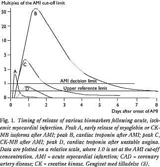 De markører, der benyttes i den daglige klinik, er de myokardiespecifikke proteiner, troponin T (TNT) og troponin I (TNI), samt MB-fraktionen af enzymet kreatinkinase (CK). Det er vedtaget, at for at kunne stille diagnosen AMI, skal der påvises en stigning af troponin over 99-percentilen for en referencegruppe (1, 2). Den i Danmark oftest benyttede troponinmarkør er TNT med en grænseværdi på 0,10 μg/l (2). Ved AMI stiger TNT efter 4-8 timer, og forhøjelsen kan holde sig i op til 12 dage (2) (Fig. 1 ).