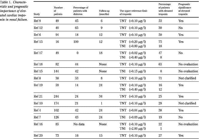I Tabel 1 er forekomsten af troponinforhøjelse hos patienter med nyrefunktionsnedsættelse resumeret. Som det fremgår, er variationen betragtelig, fra 0 til 75%.