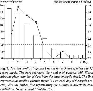 Der foreligger fire undersøgelser af i alt 71 patienter (37-40). I to af studierne fandtes en association imellem graden af venstre ventrikel-dysfunktion og troponinforhøjelse (37, 39), hvilket dog ikke har kunnet bekræftes i det tredje arbejde (38). Stigningen i troponin synes at nå et maksimum 2-3 døgn efter, at septisk chok er konstateret (39) (Fig. 3 ).