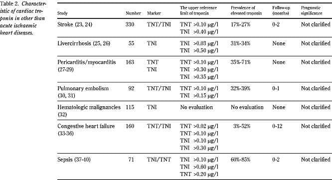 Ved de øvrige organmanifestationer synes prognosen at være uafklaret. Grunden hertil er oftest manglende opfølgningsdata. Ligeledes drejer det sig om få studier med små patientmaterialer og forskellige konklusioner. I Tabel 2 har vi opsummeret den kliniske betydning af troponinforhøjelse ved de forskellige sygdomme.