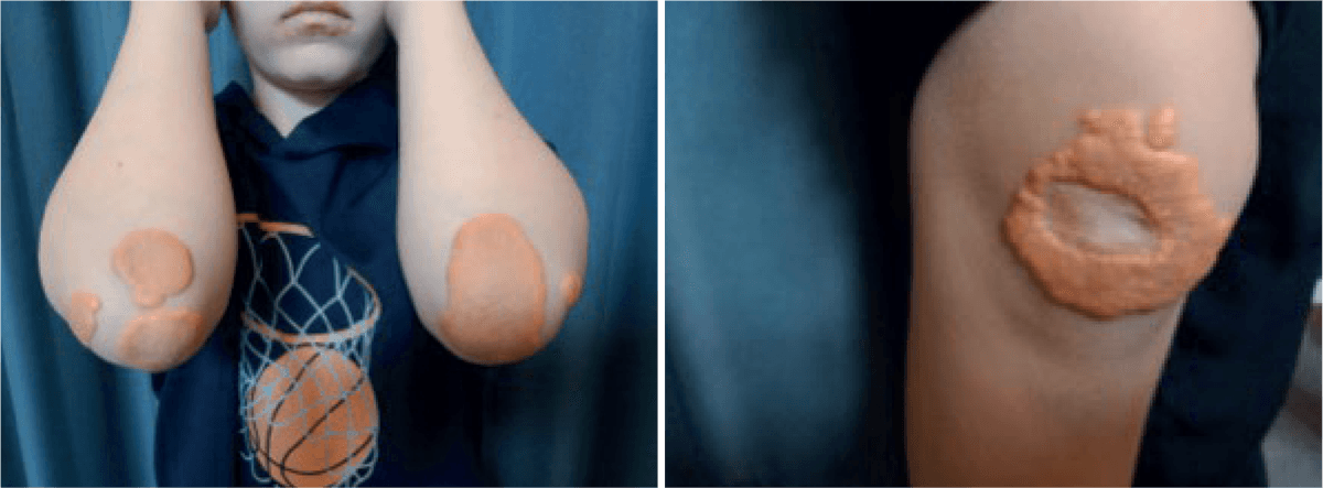 En tiårig dreng blev henvist med rød-gule, multilobulære noduli omkring albuer, knæ, akillessener og periorbitalt. Histologi viste tuberøst xantom, der var associeret med hyperlipidæmi. Paraklinisk fandtes LDL-kolesterol 22,9 mmol/l og totalkolesterol 24 mmol/l. Genetisk udredning viste compound-heterozygoti for forældrenes varianter i low-density lipoprotein receptor-genet (LDLR) med nedarvning af to nonsense-mutationer, hvilket svarer til homozygoti for familiær hyperkolesterolæmi (FH). Drengen blev henvist til medicinsk behandling på Center for Sjældne Sygdomme, Rigshospitalet.