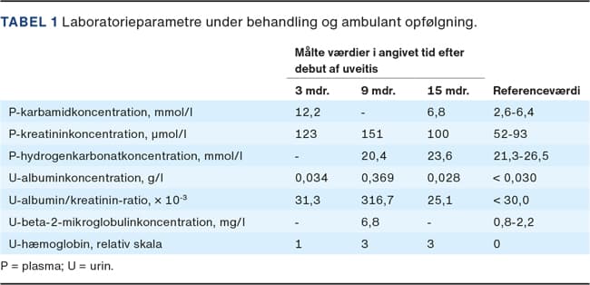 Ni måneder efter debut af uveitis fik drengen imidlertid almensymptomer med nedsat appetit og træthed. Den objektive undersøgelse var fortsat uden positive fund, og han var afebril, normotensiv og uden biokemiske eller oftalmologiske tegn på inflammation, men med stigende niveau af kreatinin, proteinuri, forhøjet u-beta-2-mikroglobulin, men uden glukosuri. En nyrebiopsi viste interstitiel inflammation med infiltration af lymfocytter og enkelte plasmaceller. Han blev behandlet med prednison 50 mg dagligt i seks uger med hurtigt faldende kreatininniveau. Man aftrappede steroidbehandlingen til ophør efter seks måneders behandling, hvor drengen var klinisk rask med et kreatininniveau på 100 μmol/l og normal urinanalyse fraset stix-hæmoglobinuri (3+). To år efter symptomdebut var han fortsat klinisk rask med et kreatininniveau på 88 μmol/l, ingen proteinuri og normale forhold uden sequelae ved oftalmologisk undersøgelse.