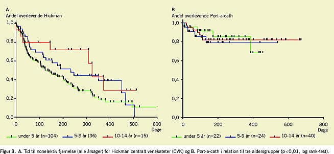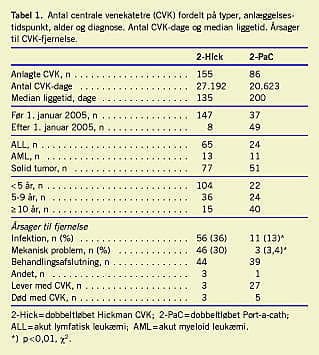 Resultater: Der blev anlagt i alt 155 2-Hick og 86 2-PaC. Det samlede antal CVK-dage var 27.192 for 2-Hick og 20.623 dage for 2-PaC. Den mediane liggetid for 2-PaC var signifikant længere end for 2-Hick (200 dage vs. 135 dage). Signifikant flere 2-Hick end 2-PaC blev fjernet nonelektivt pga. komplikationer, både infektioner og mekaniske problemer. For patienter med 2-PaC var der ingen forskel i CVK-overlevelse i relation til patientens alder. Overlevelsen af 2-Hick var signifikant kortere hos børn under fem år. 67% af de fjernede 2-PaC blev først fjernet ved afsluttet behandling, mens dette kun gjaldt for 32% af 2-Hick (p < 0,001, χ 2 -test).Ved multivariansanalyse fandtes CVK-type (p < 0,001) og barnets alder (p < 0,01) korreleret til CVK-overlevelse.
