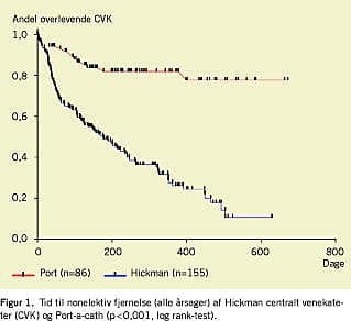 I et lignende studie, hvori man sammenlignede Hick-katetre med PaC inkluderede man også patienter, der gennemgik en stamcelletransplantation, som er forbundet med en signifikant øget komplikationsrate [7]. I dette studie blev der også påvist signifikant længere overlevelse for PaC og nogenlunde den samme frekvens af infektion som årsag til nonelektiv fjernelse som i vores studie. Fordelingen mellem dobbeltløbede og enkeltløbede CVK fremgik ikke, hvilket også har betydning for komplikationsraten, idet enkeltløbede CVK er forbundet med færre infektioner end flerløbede CVK [4, 5].