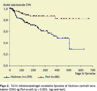 Figur 1 viser den samlede overlevelse af de to typer CVK. Det ses, at signifikant færre 2-PaC end 2-Hick blev fjernet nonelektivt pga. komplikationer (p = 0,001, log-rank-test). Hvis man udelukkende analyserer infektion som årsag til CVK-fjernelse, var der også signifikant færre 2-PaC end 2-Hick, der blev fjernet (p < 0,001, log-rank-test) (Figur 2 ).
