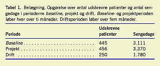 I de tre perioder har belægningsprocenten været henholdsvis 85 i baseline, 93 i projektperioden og 97 i driftsperioden. Belægningsprocenten er dermed steget med 12 procentpoint. Den gennemsnitlige liggetid har i de tre perioder været 7,0 døgn i baseline, 7,4 døgn i projektperioden og 7,1 døgn i driftsperioden. Antal udskrevne patienter og antal sengedage fremgår af Tabel 1 .