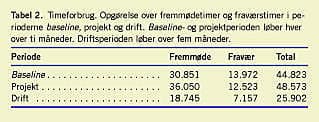 Timeforbrug - fremmøde og fravær - for respektive perioder fremgår af Tabel 2 . Fremmødetimer i projektperioden indeholder 3.120 timer for to projektsygeplejersker og projektleder. Sidstnævnte repræsenterer 1.344 timer.